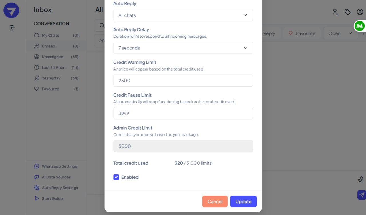 * <mark style="color:blue;">**Credit Pause Limit**</mark> (Ai will stop functioning based on the Total credit used. For example, if you set the Credit Pause Limit to 500, Ai will not function when the total credit used reaches 500)