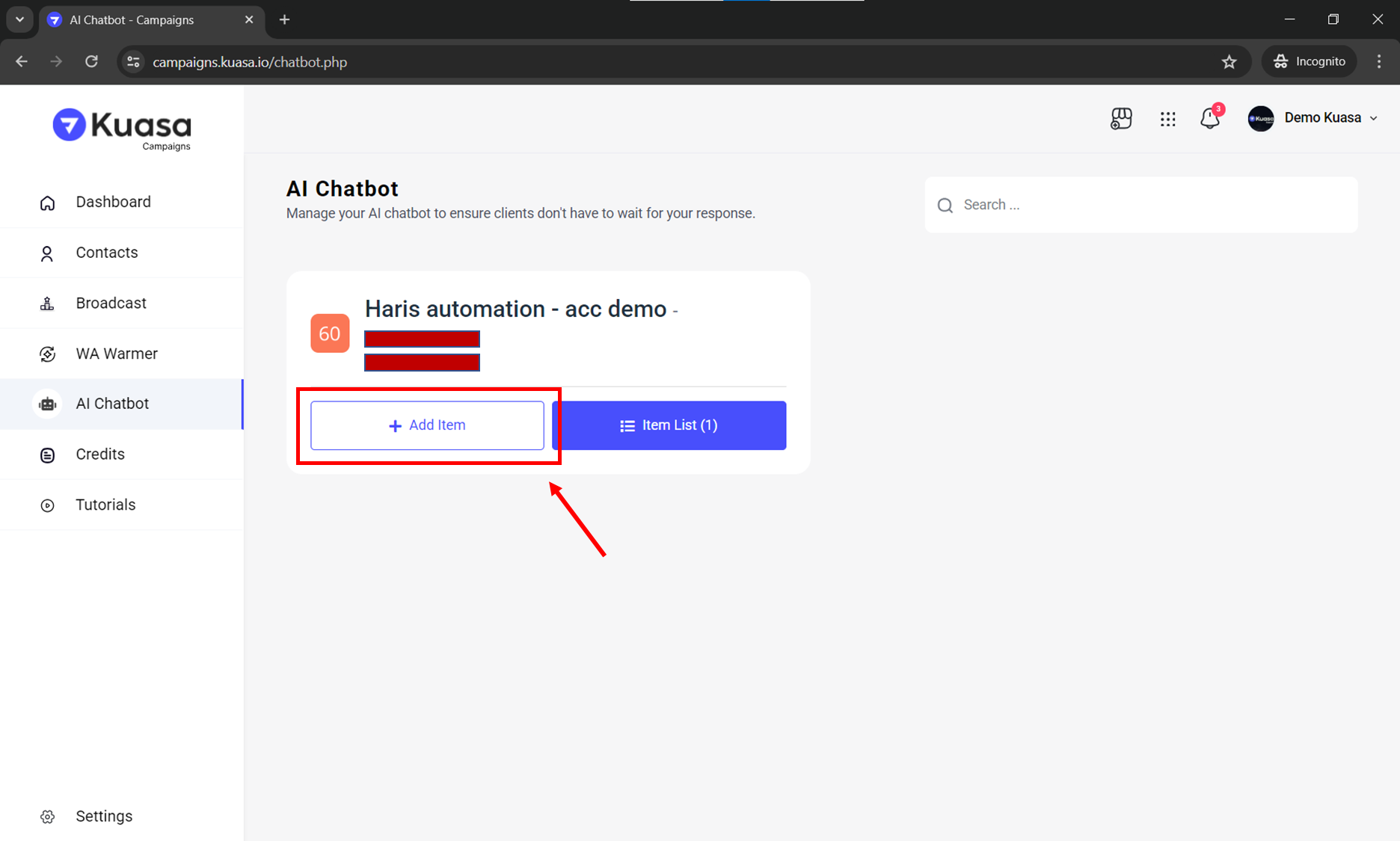 # Create AI Chatbot item in Kuasa