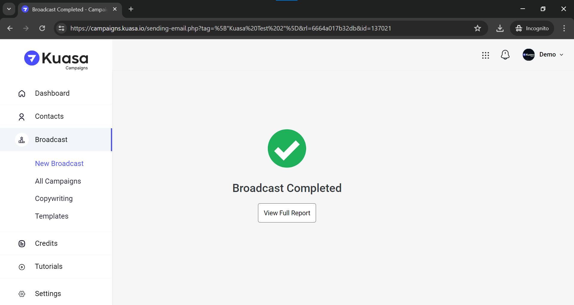 Here, you can verify the accuracy of the sentence that will be broadcast. You can move on to the next step if it is correct; otherwise, simply click the box to amend your sentence. You can enter your display name, email topic, etc. You might try sending an email to your contact first to see how they will respond before sending them a broadcast. Simply enter your email address and select Test Send. Click Send to start broadcasting to your contact list if everything is satisfactory. Click Leave to end the Email Broadcast if you wish.