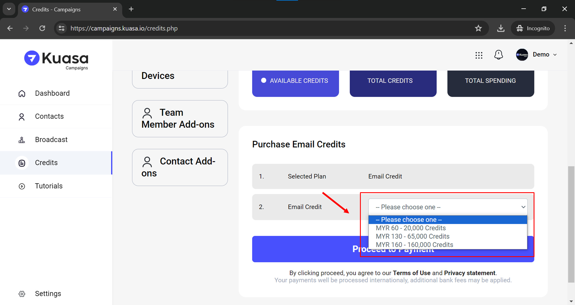 5. Select the **Email Credits** package you want and click **Proceed to Payment** button.