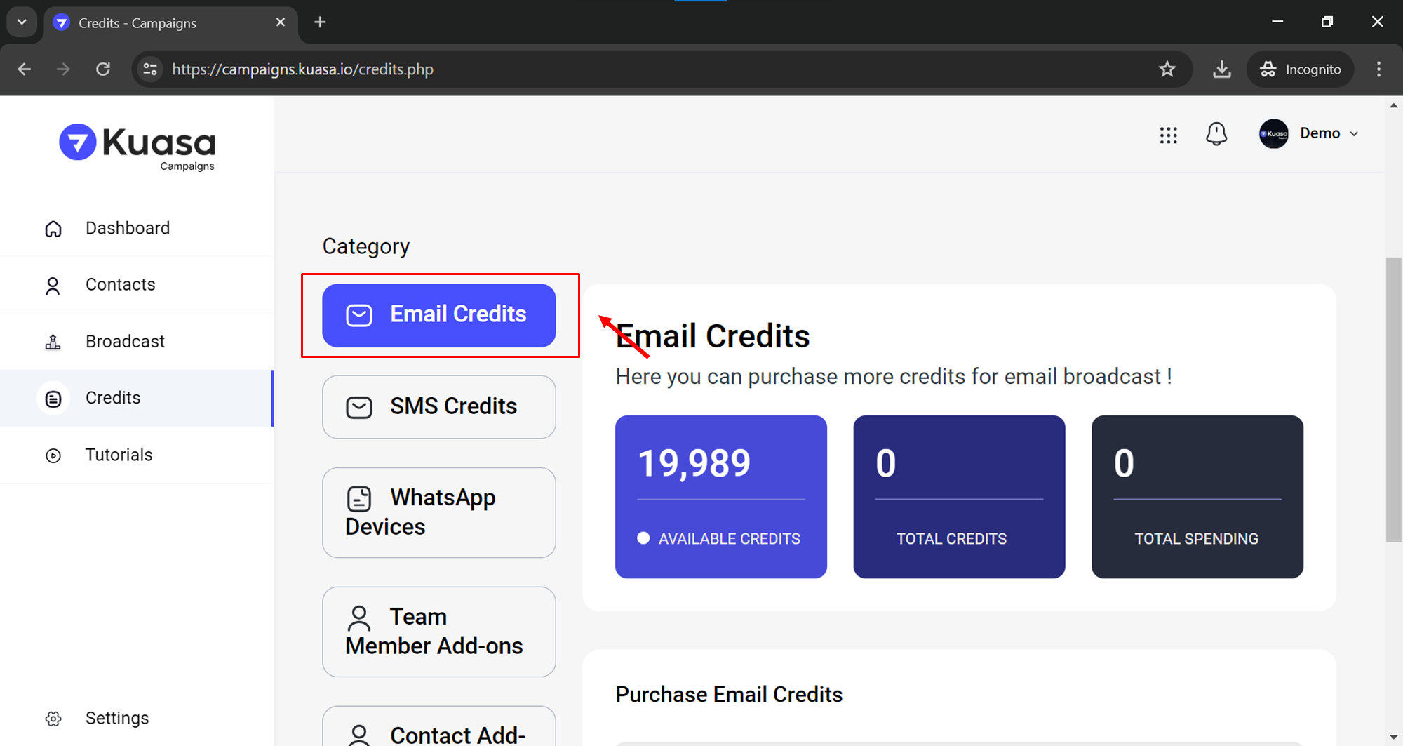 7. Congratulations! You have successfully purchased Email Credits.&#x20;