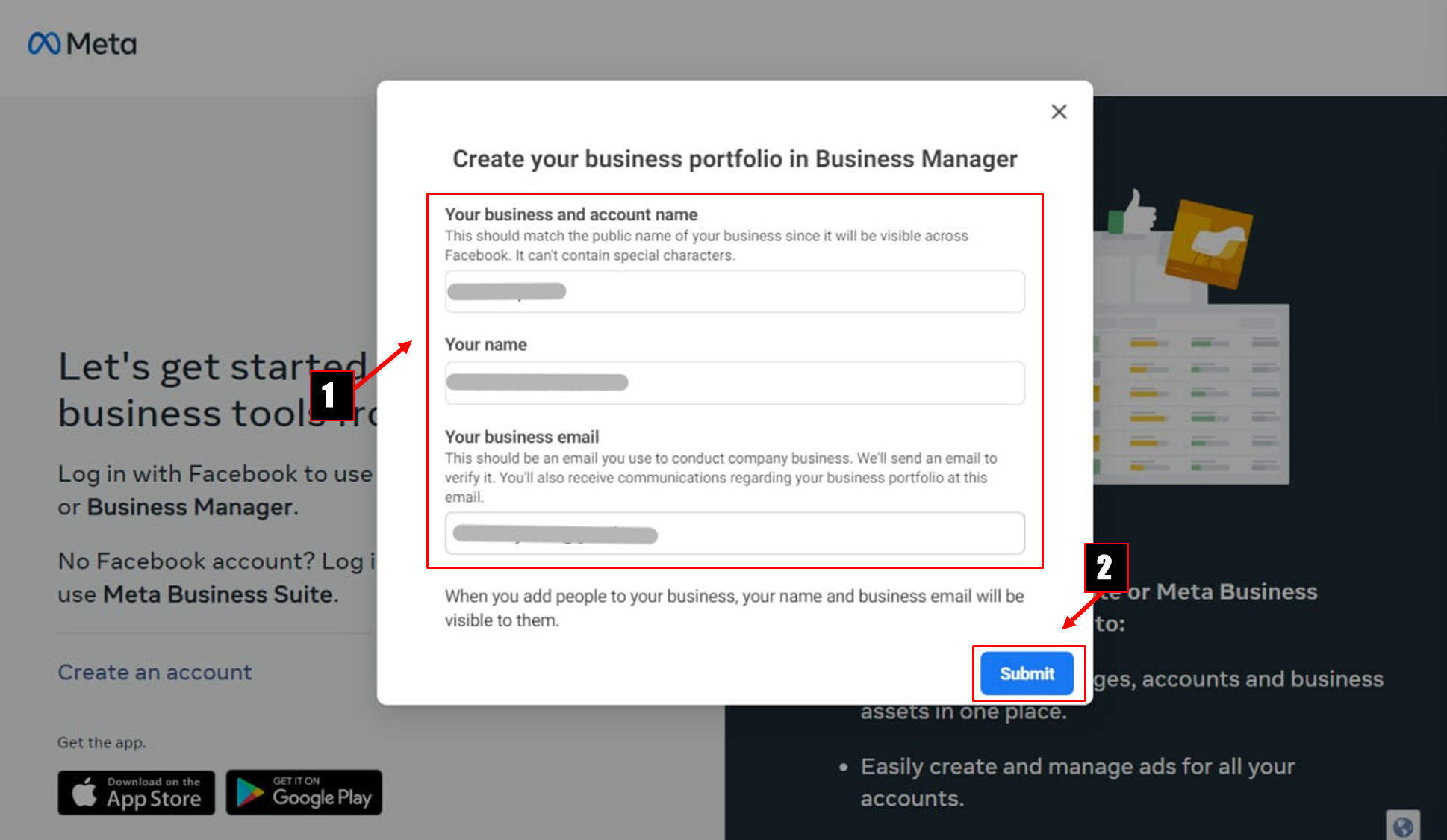 5. Fill in the required details (business and account name, name, business email), then click **Submit** button.