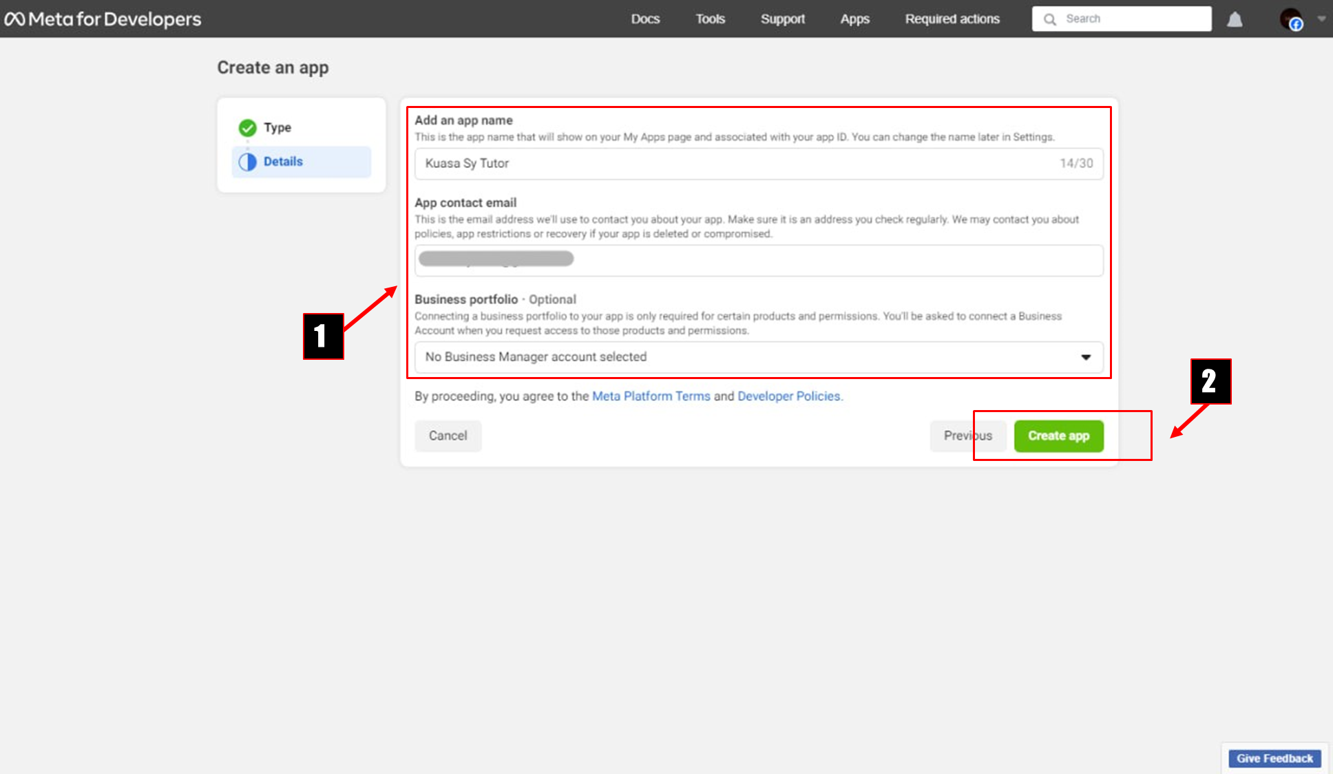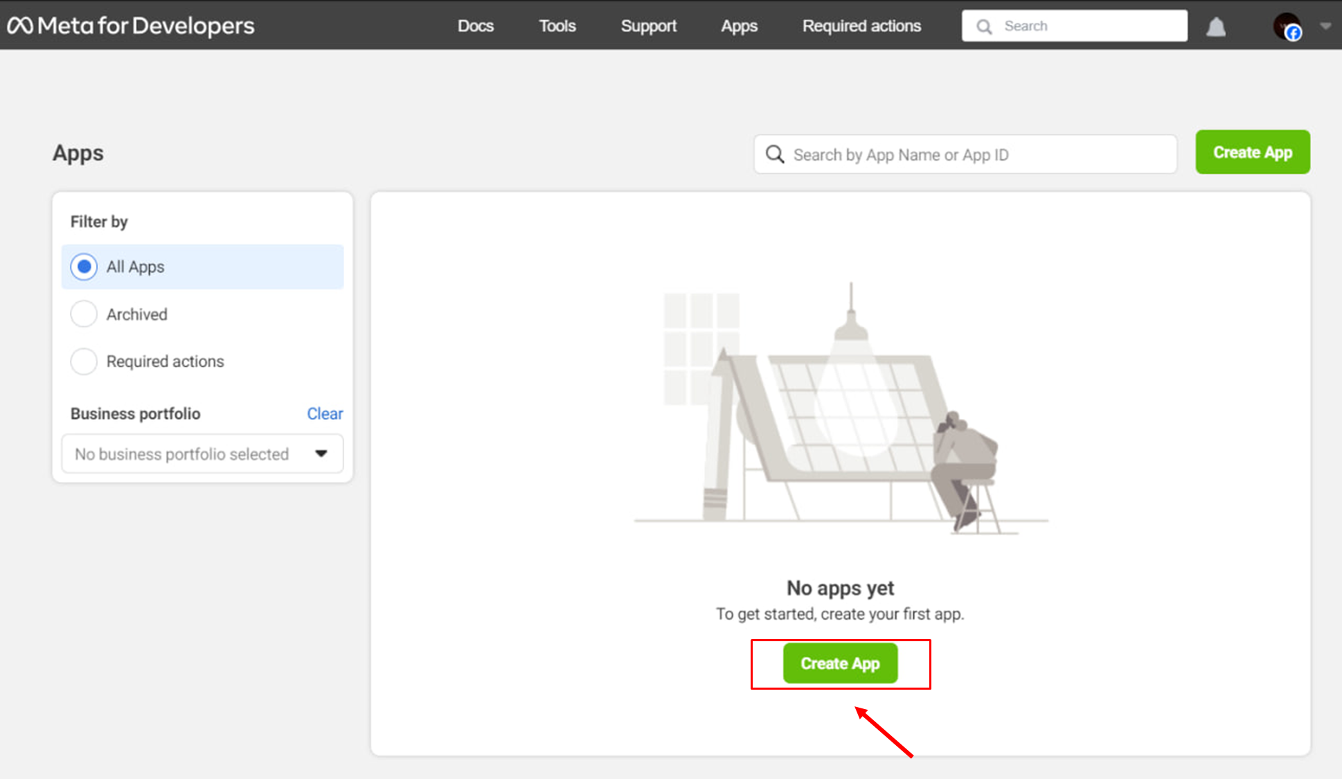 After completing the registration of Meta developer account, click **Create App** button on the same page or open the new tab link <https://developers.facebook.com/apps/creation/> to create your first app.