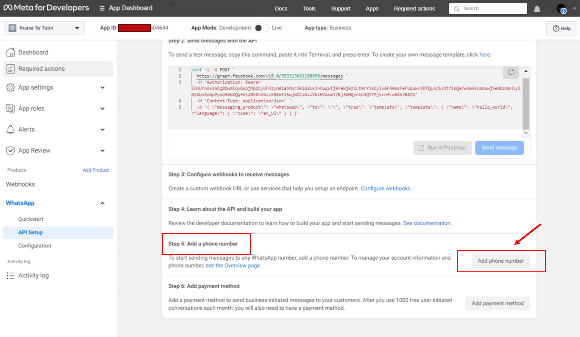 8. Scroll down to Step 5, Click the **Add phone number** button to link your phone number to the **Meta WhatsApp API.**