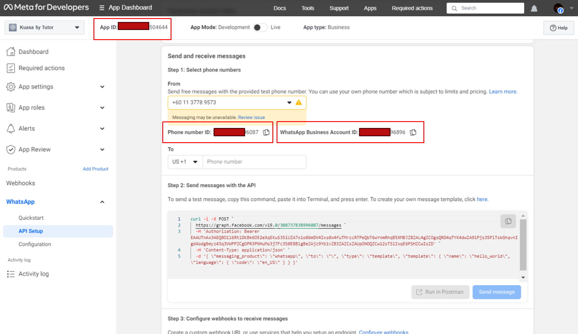 13. After completing everything, under Step 1, please copy the **App ID**, **Phone Number ID**, and **WhatsApp Business Account ID**, then paste them into Kuasa settings (Whatsapp integration > Whatsapp Official) (<https://campaigns.kuasa.io/whatsapp-integration.php>).
