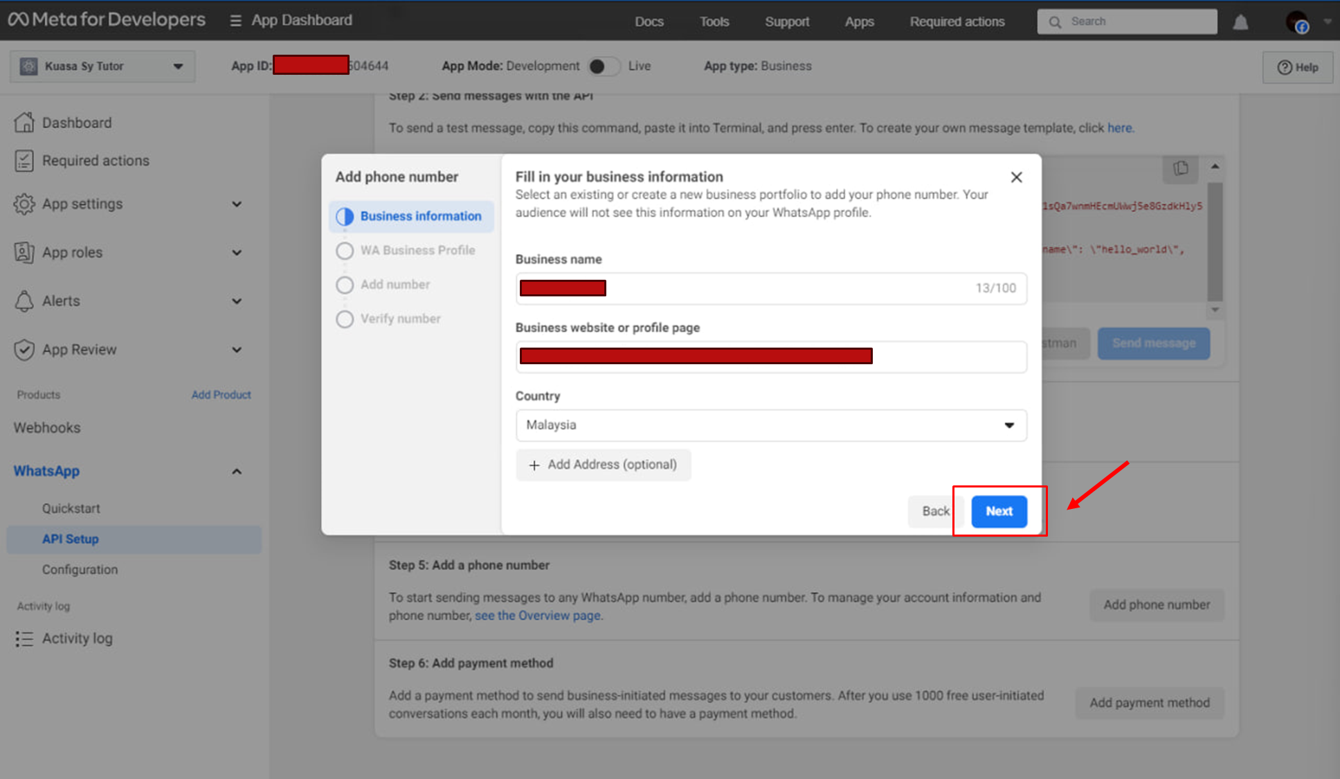 7. Click **Start using the API** button or Under the **WhatsApp** section, click on **API Setup**, then click on the **Continue** button.