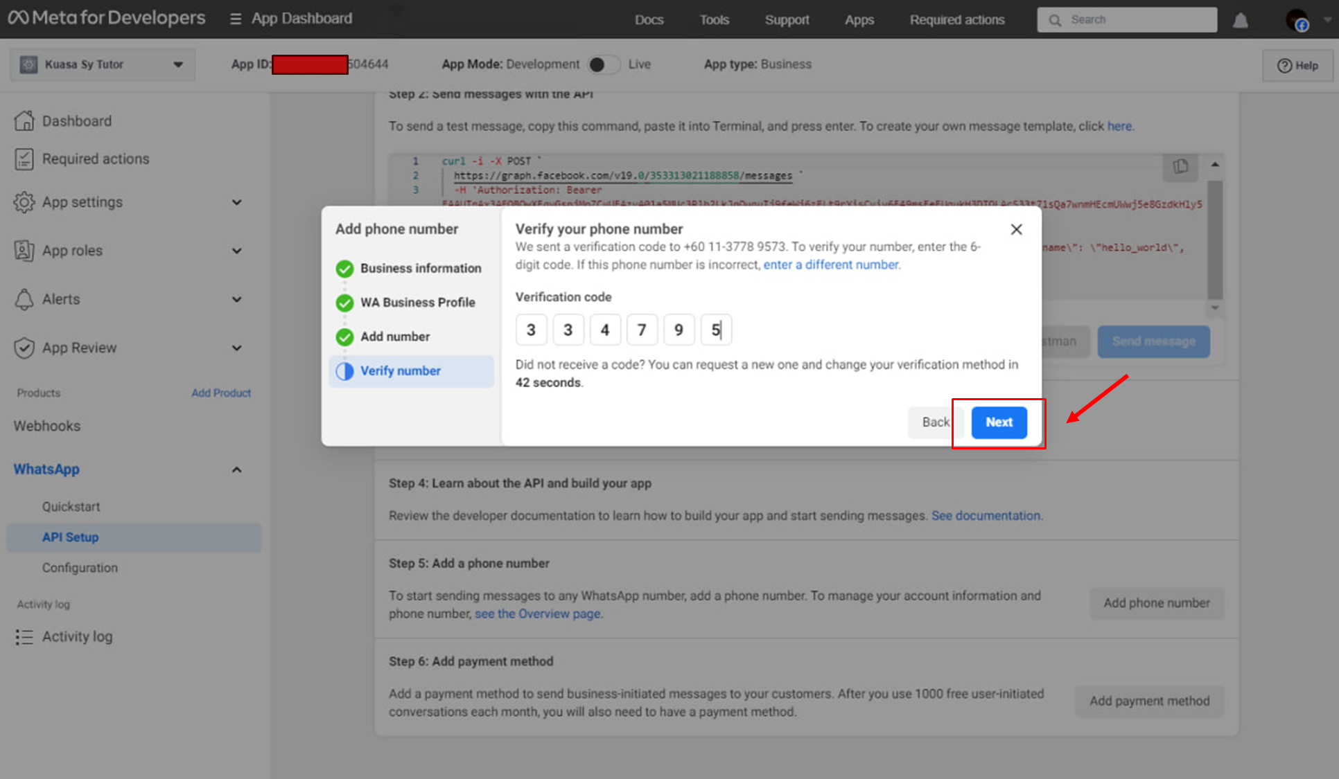 12. At **Verify number**, input the code received from SMS or call, then click the **Next** button.