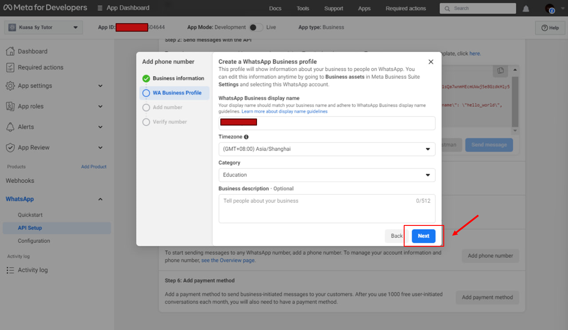 10. At **WA Business Profile**, fill in all the details. For the Malaysia Timezone, choose \[(GMT+08.00) Asia/Kuala Lumpur], then click the **Next** button.