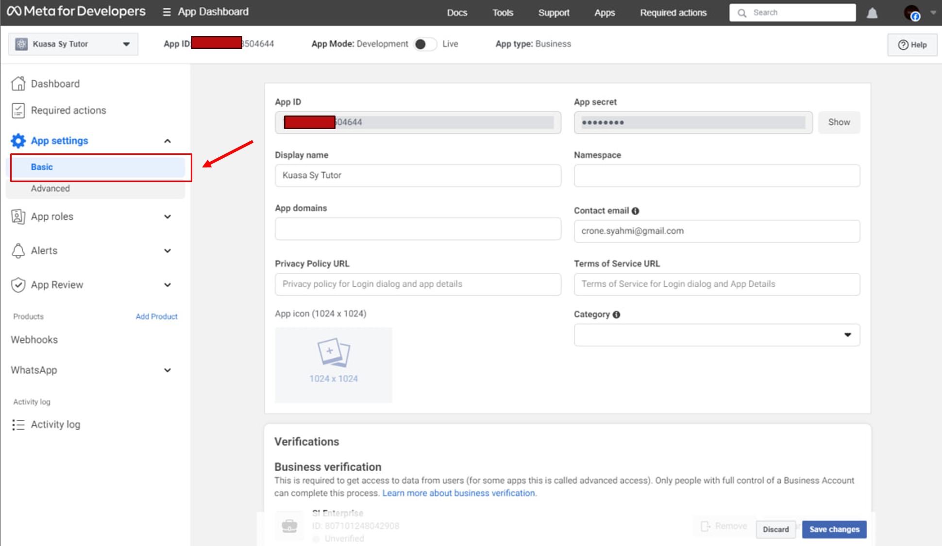 14. **Almost Done!** Now go to the **App Settings** section (top left) -> **Basic**.