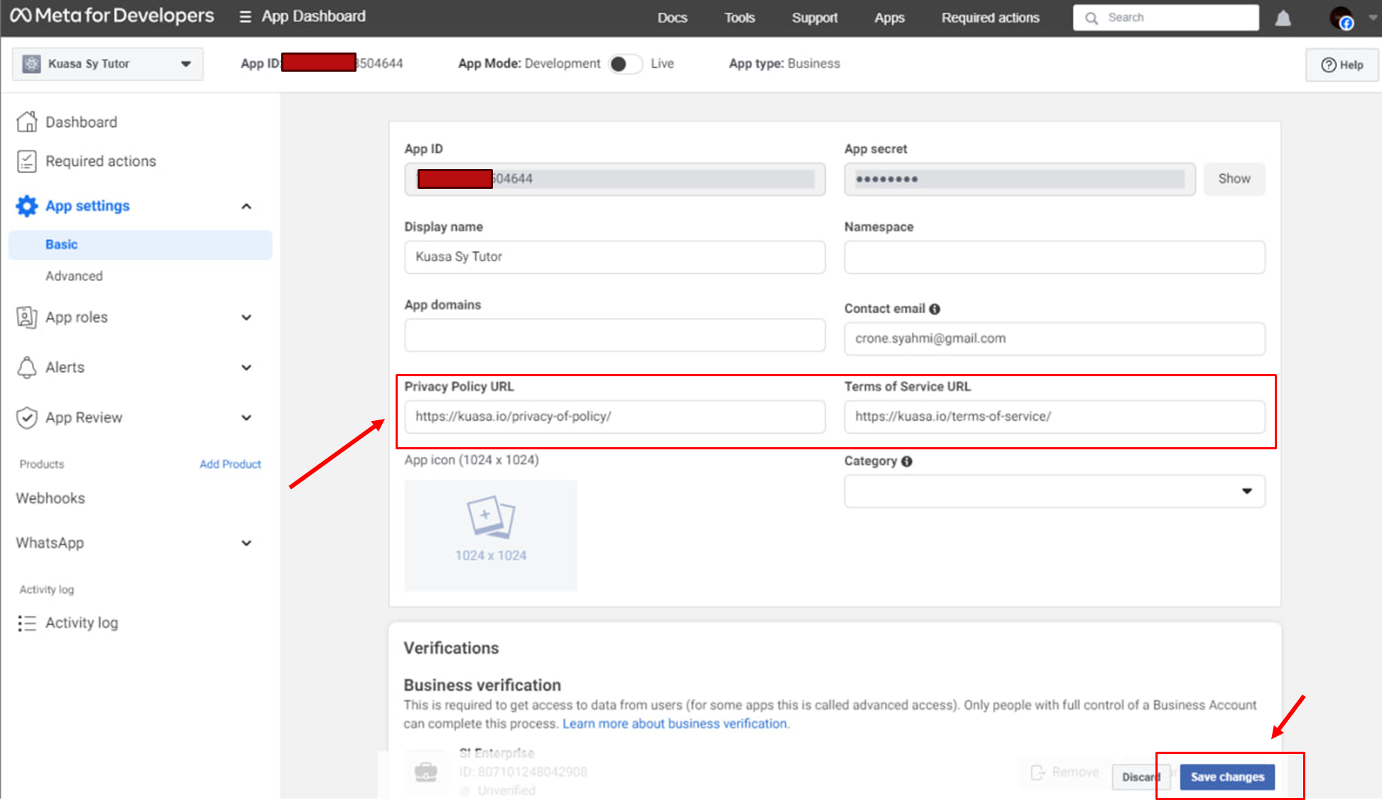 15. Copy the **Privacy Policy URL and Terms of Service URL** to your account.