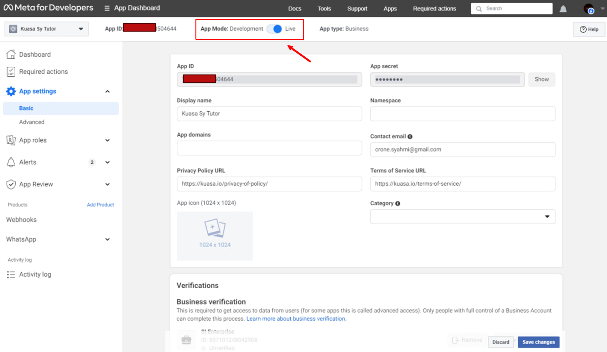 17. Finally, switch **App Mode** from Development to Live to initiate (**click Reload or click twice**).