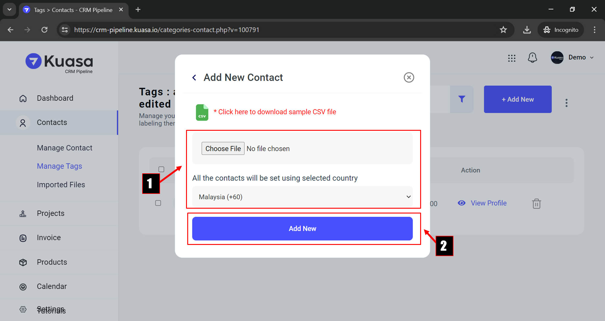 5. Step 1: Upload your CSV file that contains all the contacts by clicking the **Choose File** button.\