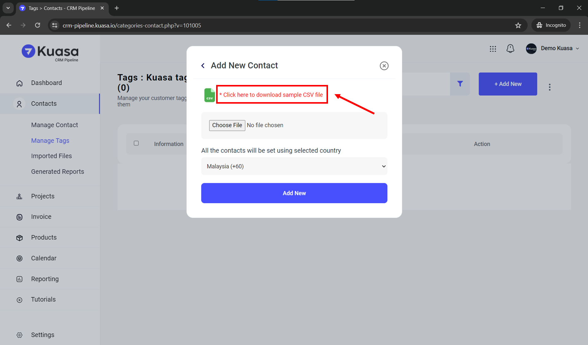 7. Click the red link to download CSV file template.
