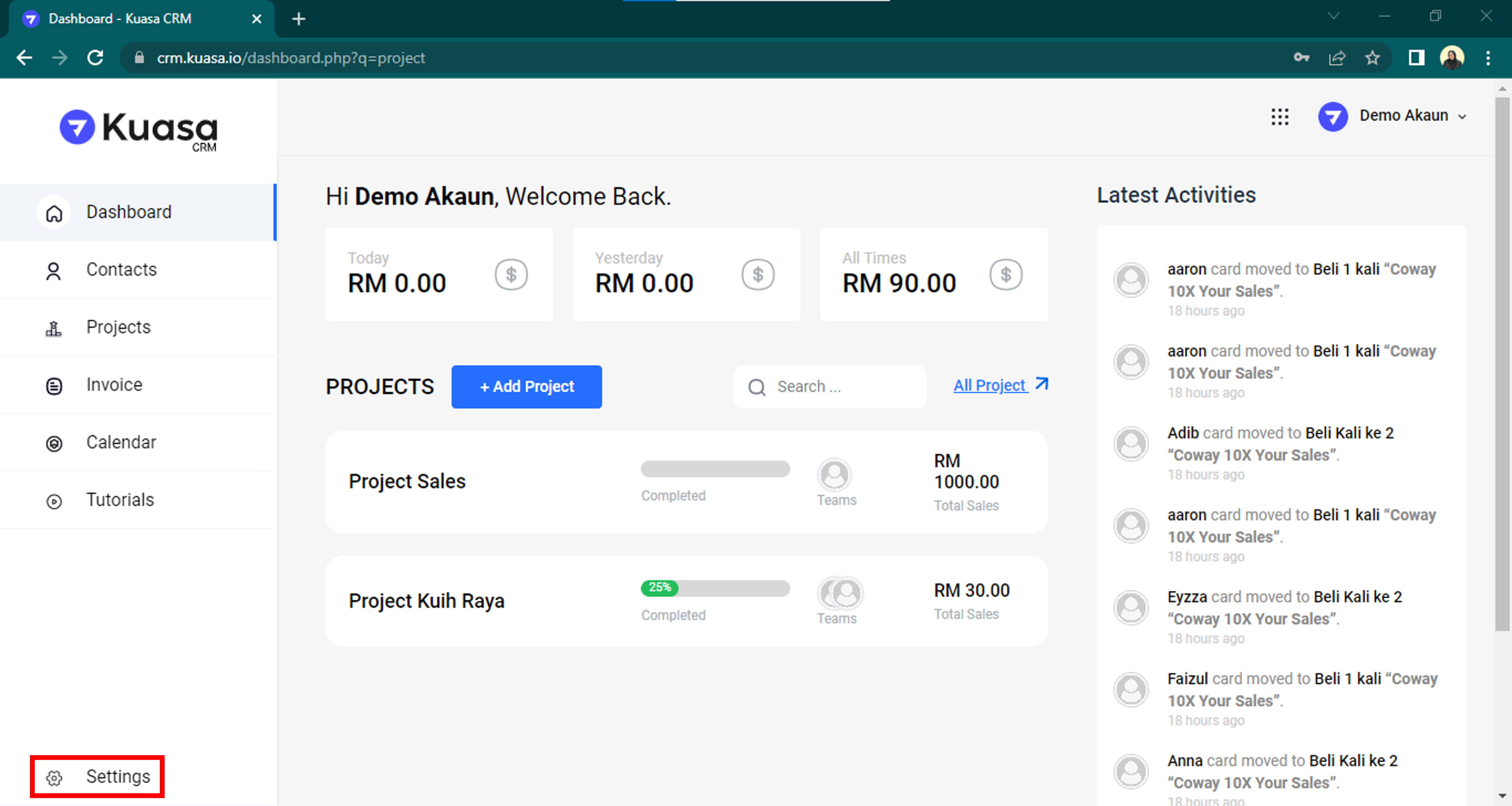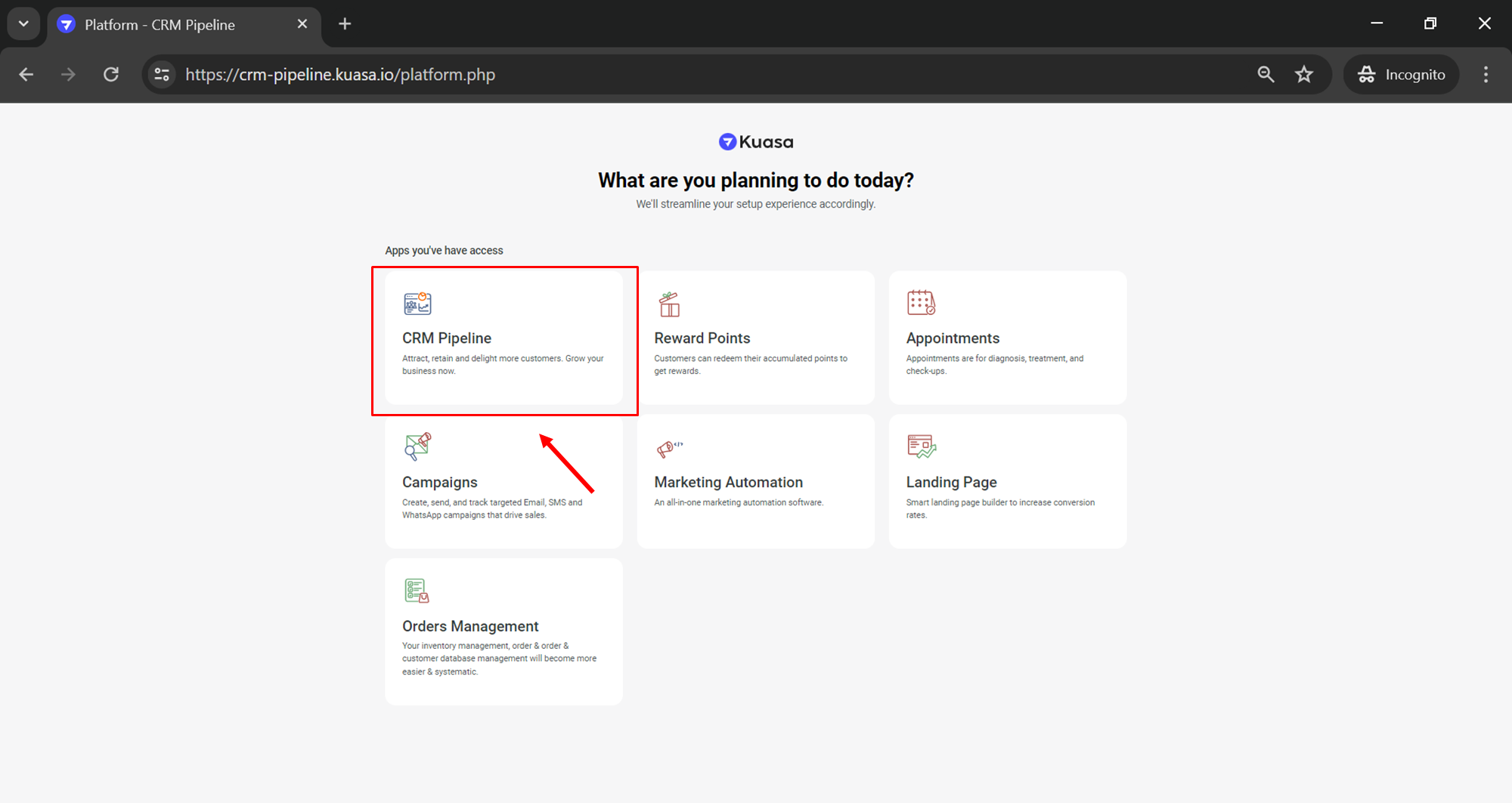 1. Login to your account via [**https://crm-pipeline.kuasa.io/**](https://crm-pipeline.kuasa.io/)**.**