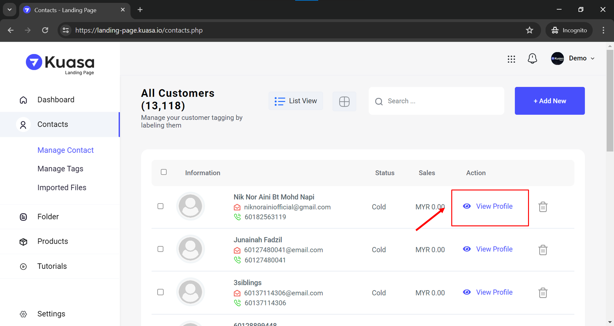 4. Select the contact you want to update or add information to and click **View Profile**.