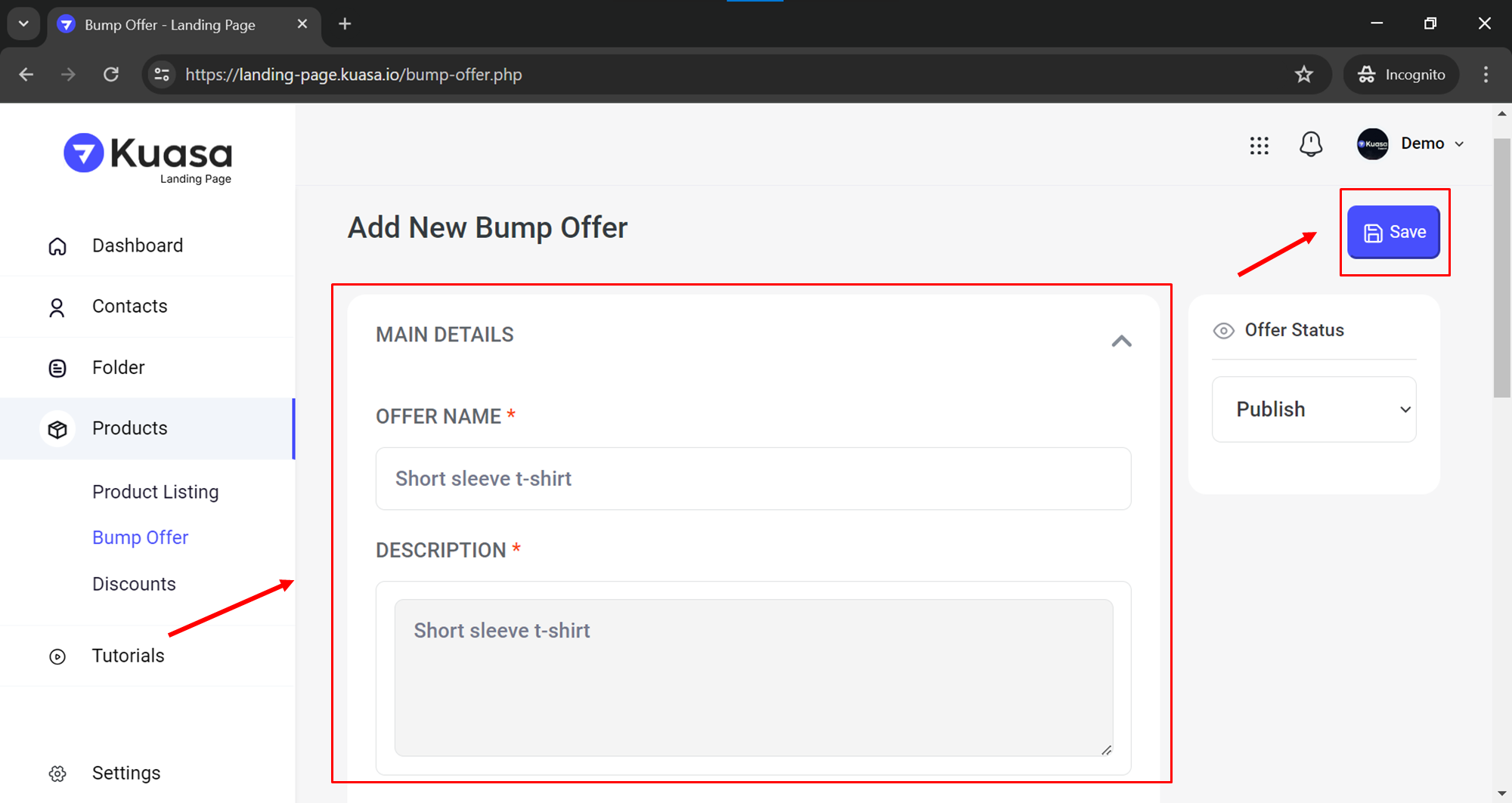 Fill in the details needed for the Bump Offer and click Save button.